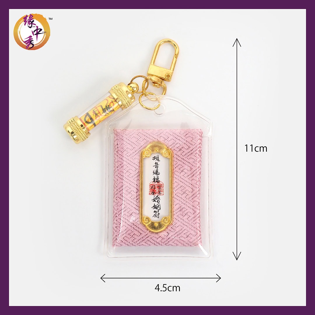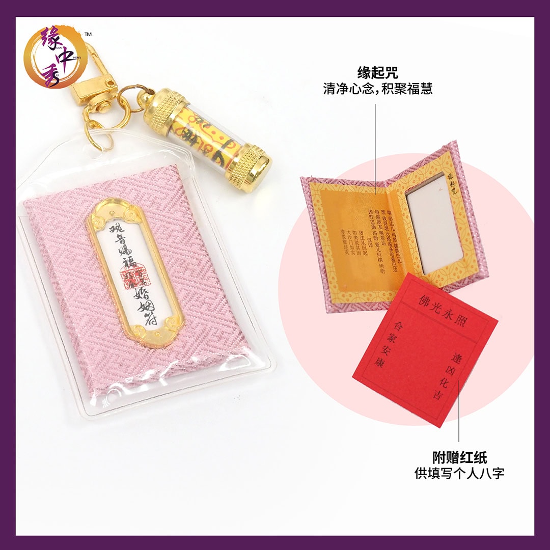 由紫杉阁洪道长开光及加持的【月老赐福姻缘符】, 加上缘起咒,全称『诸法因缘生咒』,为释迦牟尼佛所宣说的核心教义之一。犹如摧毁黑暗的一盏明灯,断除邪念的锐利宝剑,医治烦恼痛苦的妙药,消除恶缘,成就顺缘,达成所愿!