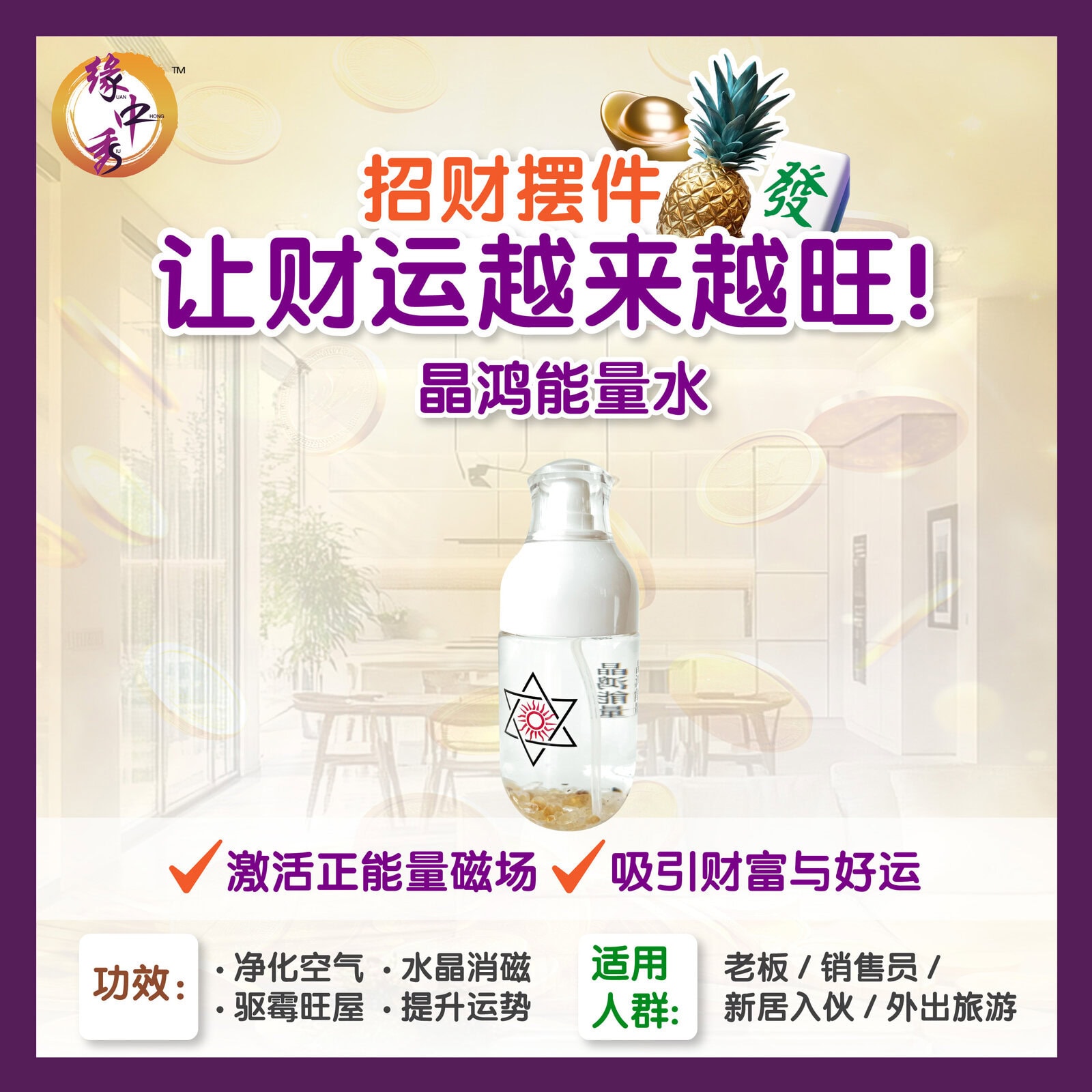 晶鸿能量水为缘中秀独家能量产品,融合黄水晶与化煞符令,蕴含强大财富与护身磁场,焕活旺运和驱除煞气。是居家大扫除必备的良品。